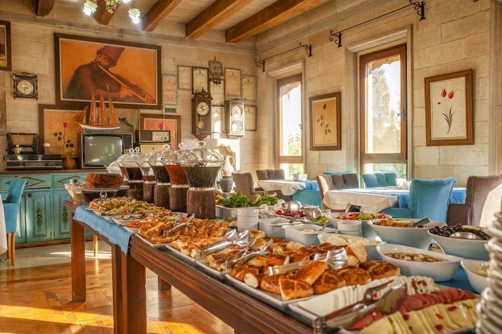 Kendinizi Kapadokya’da yoğun bir çevre gezisine hazırlayın ve geleneksel Türk kahvaltısının tadını çıkarın! Açık büfe kahvaltımız, restoranımızda saat 08.00’dan 10.30’a kadar servis edilmektedir. Kahvaltıda yöresel farklı ekmek çeşitleri, taze domates, salatalık, biber, zeytin, farklı peynir çeşitleri, yumurta (haşlanmış, yağda ya da omlet tarzında), yoğurt, meyve suyu, süt, kahvaltılık gevrek, bal, ev yapımı reçel çeşitleri, kuru meyve, taze çay ve kahve sunmaktayız. Tüm meyve ve sebze çeşitlerimiz organiktir ve bu bölgeden toplanmaktadır. Kahvaltı, oda fiyatlarına dahildir.internet hizmetimize otelin her köşesinden erişilebilir ve misafirlerimize, arabalarını otelin önüne park edebilmeleri için fazlasıyla boş alan sunulur. Otelimiz, meşhur Göreme Açık Hava Müzesi’ne sadece 1 km uzaklıkta yer almaktadır. Kapadokya’yı ister yayan ister otelimizin size sunduğu şahane tur hizmetlerinden yararlanarak keşfedebilirsiniz.